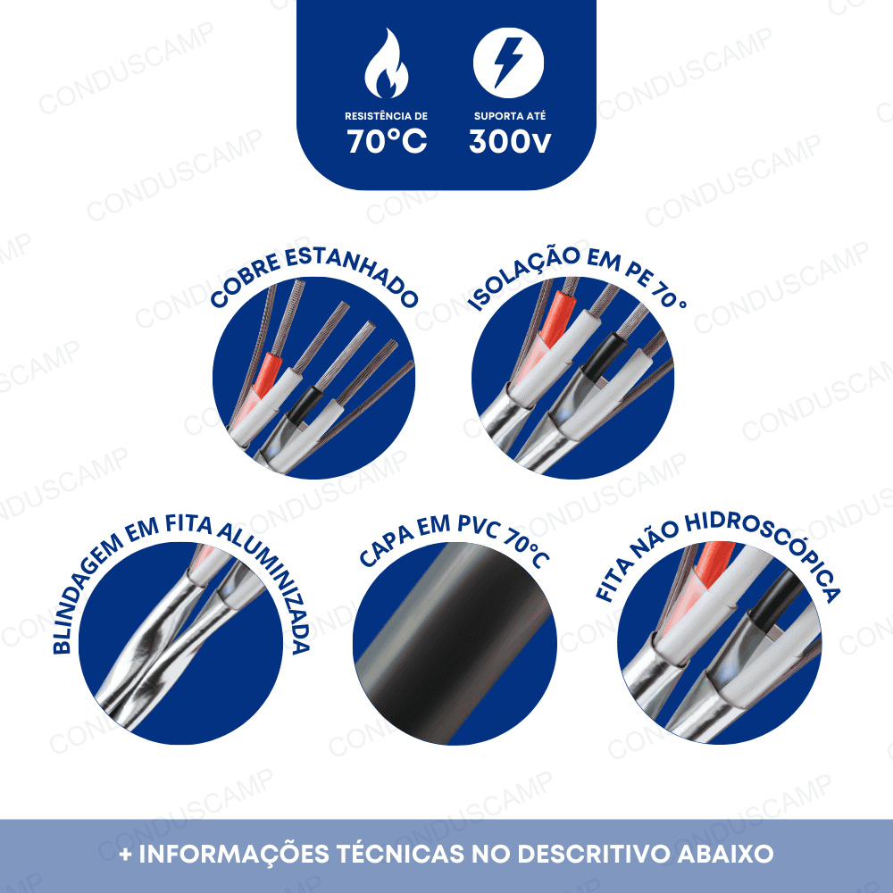 Este cabo é formado por fios de cobre estanhado, com classe de encordoamento 5, e possui isolamento em PE e cobertura em PVC. Ele possui uma blindagem em fita de alumínio, o que garante uma proteção contra interferências eletromagnéticas. Além disso, é um cabo flexível que suporta uma tensão de até 300v e temperaturas de até 70 graus, tornando-o adequado para uso em diversos tipos de instalações elétricas.
