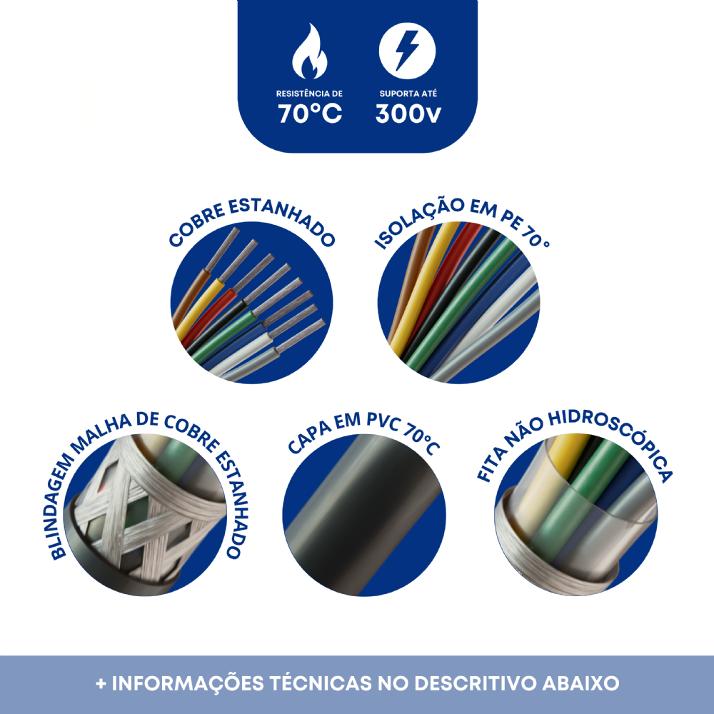 Este cabo é formado por fios de cobre estanhado, com classe de encordoamento 5, e possui isolamento em PE e cobertura em PVC. Ele possui uma blindagem de 75% em malha de cobre estanhado, o que garante uma proteção contra interferências eletromagnéticas. Além disso, é um cabo flexível que suporta uma tensão de até 300v e temperaturas de até 70 graus, tornando-o adequado para uso em diversos tipos de instalações elétricas.