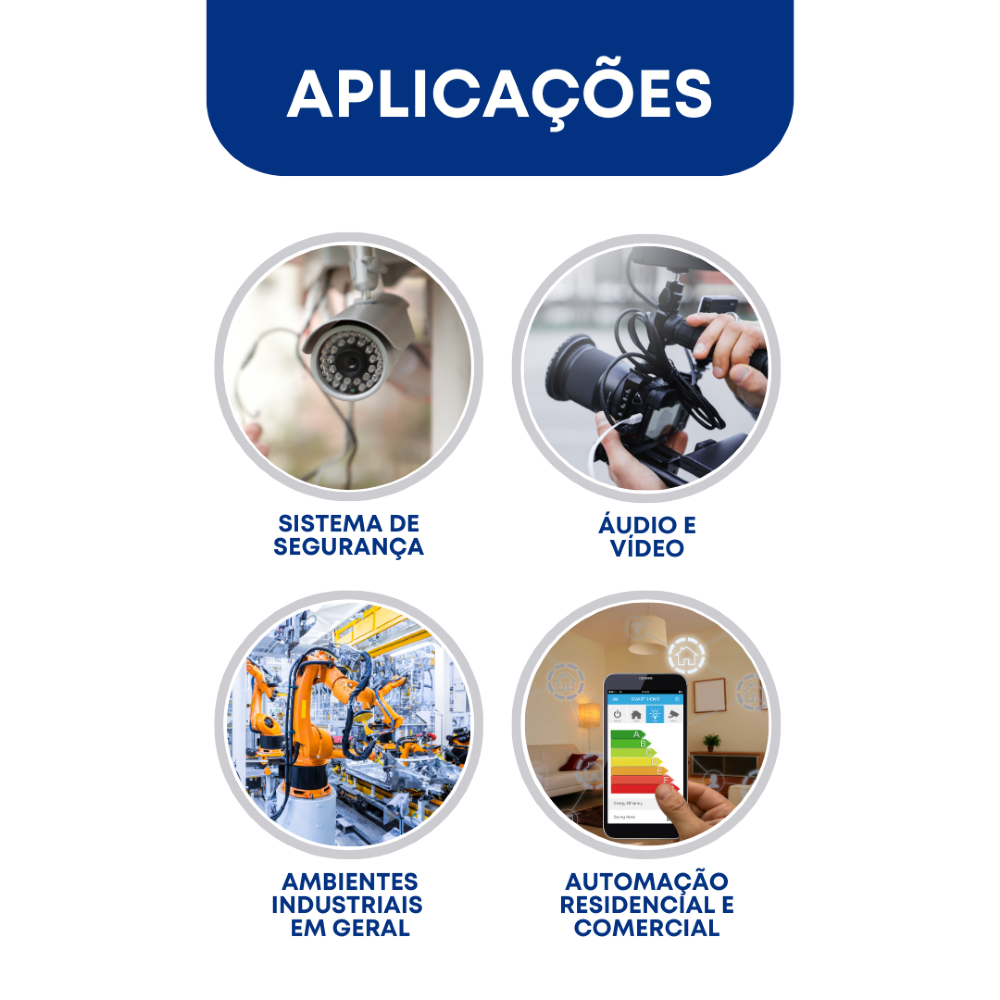 Esses cabos também são amplamente utilizados em sistemas de automação predial, tais como: iluminação, ar-condicionado, segurança eletrônica, som ambiente, entre outros.