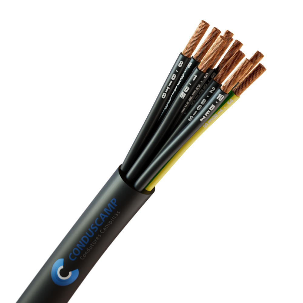 Cabo de comando sem blindagem de 500v de 10 vias de 0,50mm2 capa externa na cor preta e uma das vias interna com identificação na cor verde/amarela (brasileirinho). Vendido por metro.