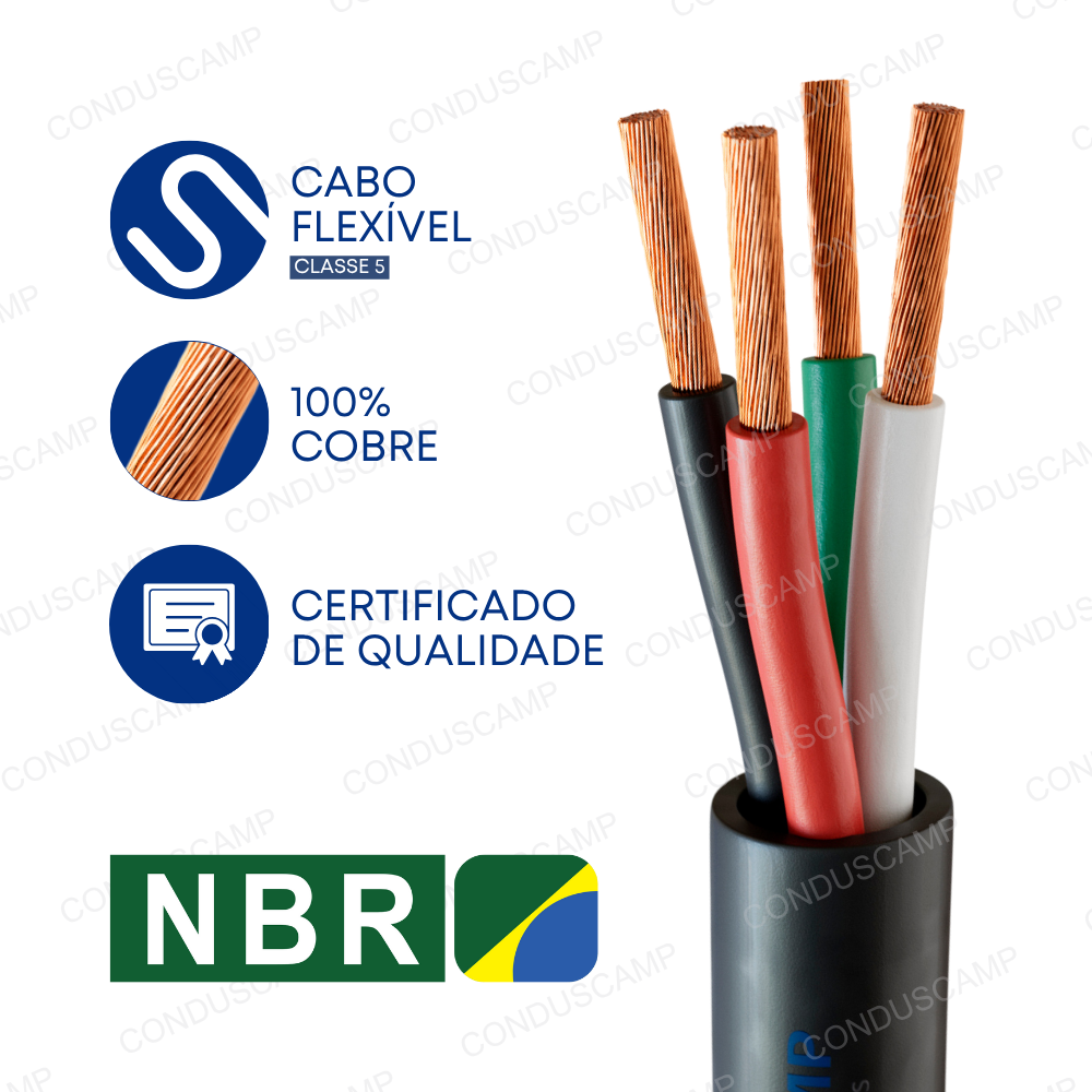 O cabo é produzido 100% com cobre eletrolítico nu. Sendo o condutor formado por fios, com uma classe de encordoamento 5 (flexível).
