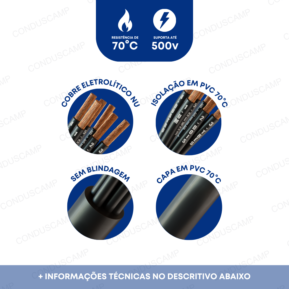 O cabo é produzido 100% com cobre eletrolítico nu. Sendo o condutor formado por fios, com uma classe de encordoamento 5 (flexível).