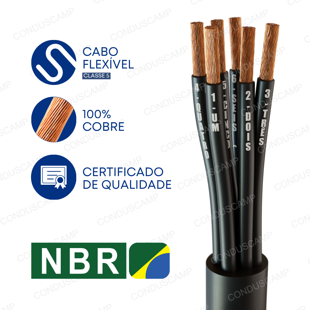 O cabo é produzido 100% com cobre eletrolítico nu. Sendo o condutor formado por fios, com uma classe de encordoamento 5 (flexível).