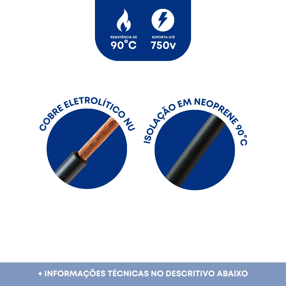 O cabo de solda é extraflexível, suporta uma tensão de até 750v, formado por fios de cobre eletrolítico nu com classe de encordoamento 6 e isolação em neoprene para temperaturas em regime de até 90 graus.