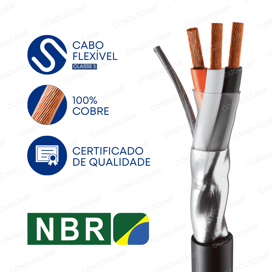 O cabo é produzido 100% com cobre eletrolítico nu. Sendo o condutor formado por fios, com uma classe de encordoamento 5 (flexível).