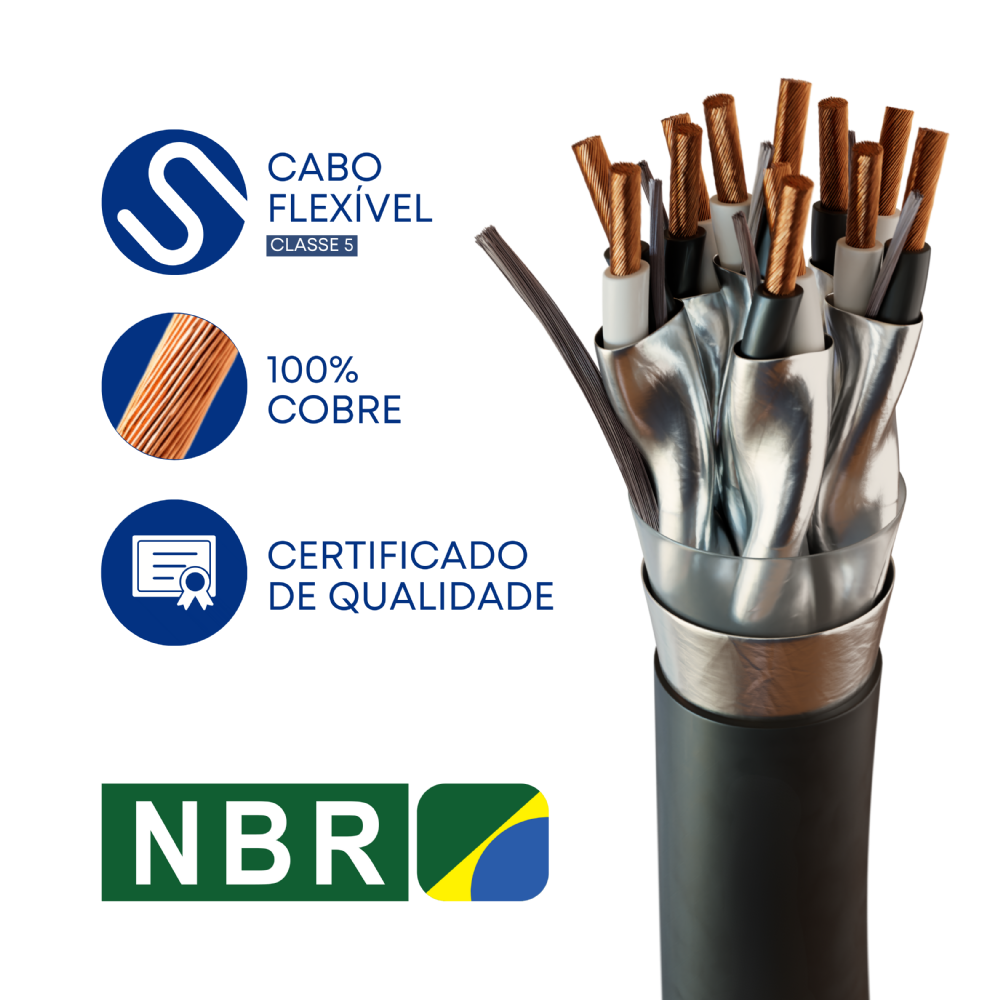 O cabo é produzido 100% com cobre eletrolítico nu. Sendo o condutor formado por fios, com uma classe de encordoamento 5 (flexível).