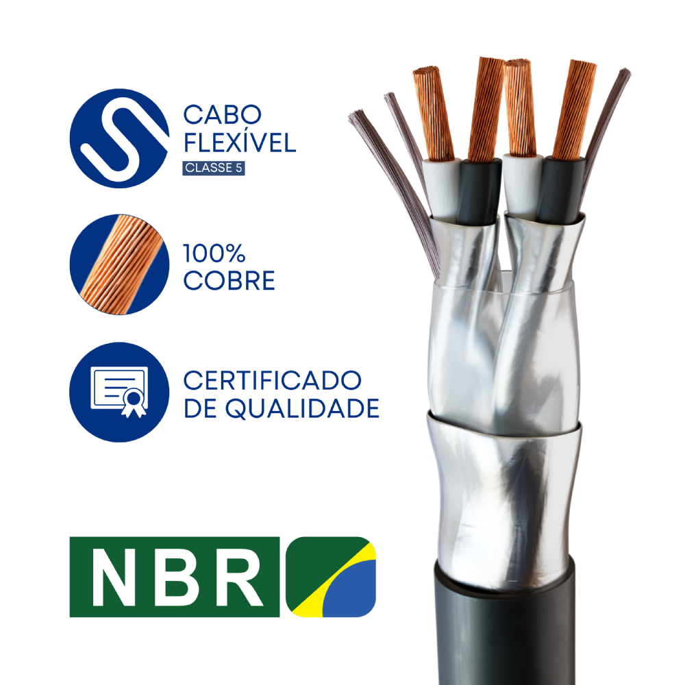 O cabo é produzido 100% com cobre eletrolítico nu. Sendo o condutor formado por fios, com uma classe de encordoamento 5 (flexível).