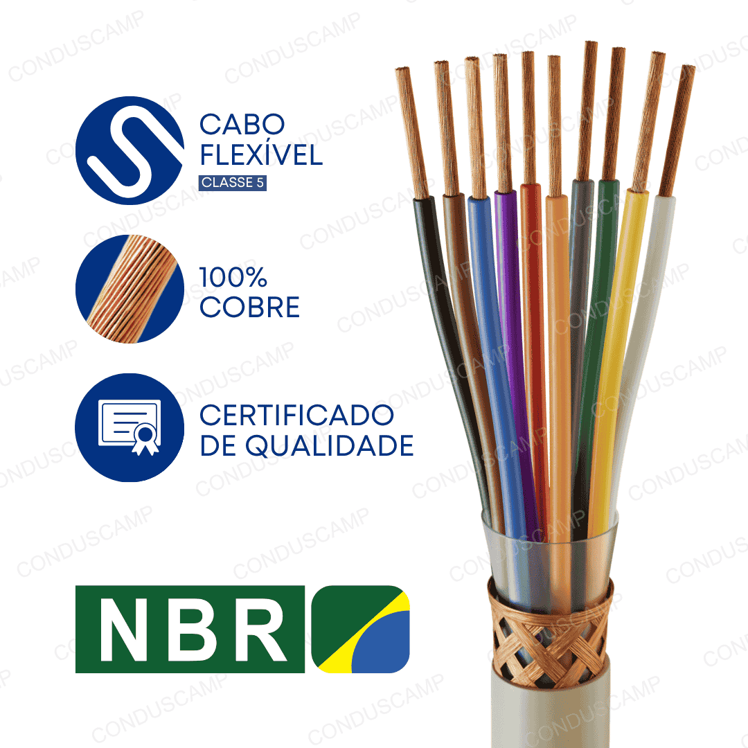 O cabo é produzido 100% com cobre eletrolítico nu. Sendo o condutor formado por fios, com uma classe de encordoamento 5 (flexível).